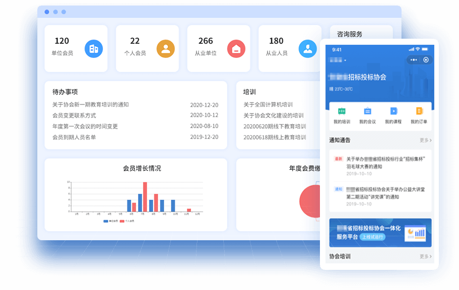 安訊協(xié)會一體化服務(wù)平臺,是按照“互聯(lián)網(wǎng)+社會組織”的理念,采用 “云計算、大數(shù)據(jù)”等先進(jìn)信息技術(shù),立足協(xié)會服務(wù)會員、規(guī)范市場秩序、開展行業(yè)自律等需求,建立的一體化管理與服務(wù)平臺,集成會員、從業(yè)人員、從業(yè)單位管理,通知、培訓(xùn)、會議、咨詢、資源、直播服務(wù),以及門戶網(wǎng)站、移動應(yīng)用,實現(xiàn)協(xié)會各業(yè)務(wù)數(shù)字化整合,全面提升各方獲得感,為協(xié)會服務(wù)國家、社會、行業(yè)提供全面的信息化支撐。